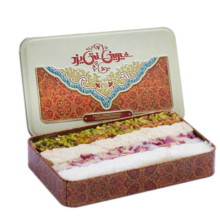ترکیبات : لوز بادام : مغز بادام شربت اینورت عرق بیدمشک پودر قند مغز بادام مغز پسته لوز نارگیل :پودر نارگیل،شربت اینورت،پودر قند باقلوا: شربت اینورت ،مغز بادام پودر قند آرد گندم لواش باقلوا روغن گیاهی هل
